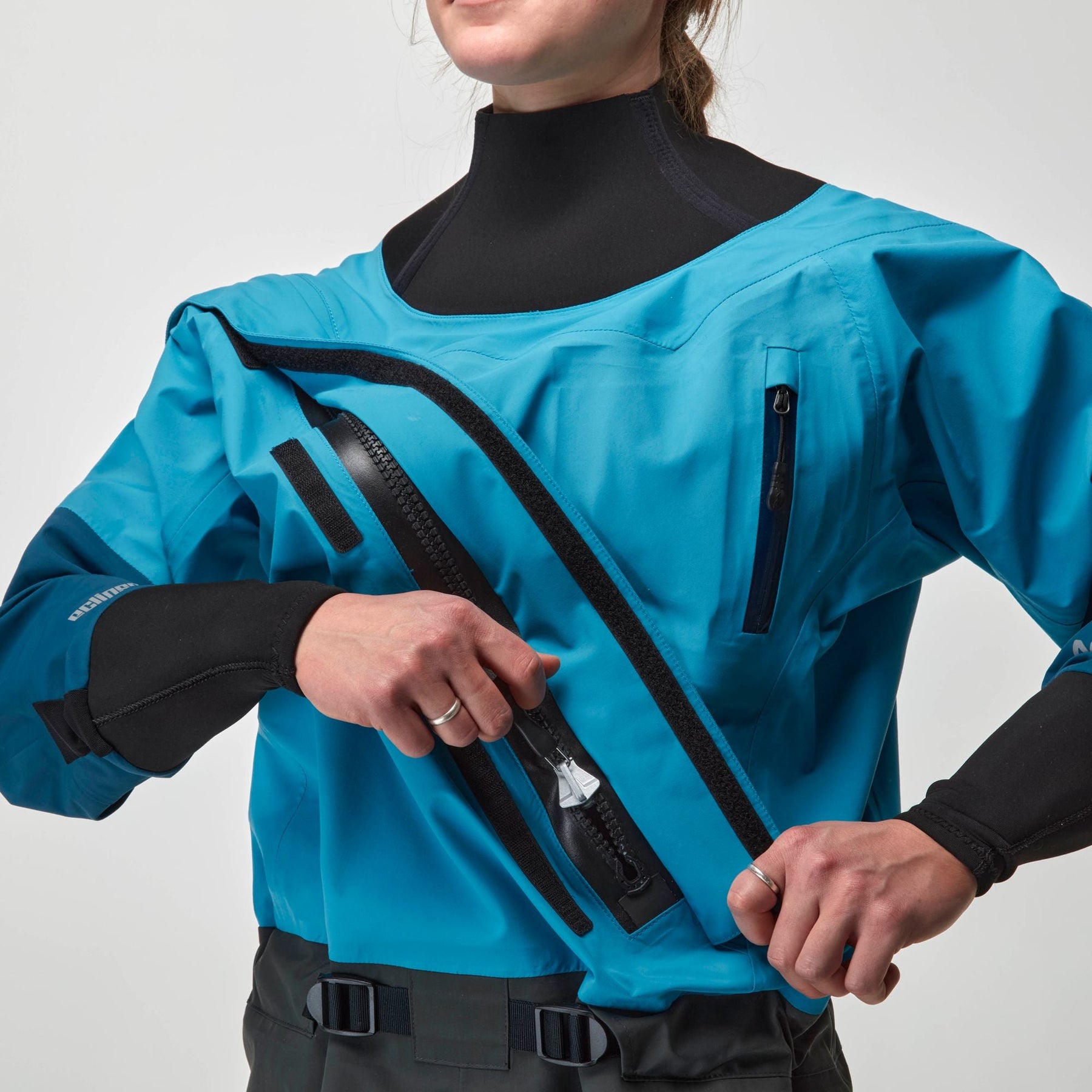 - Les manchons en latex avec surmanchettes de protection en néoprène permettent de garder les bras au sec.